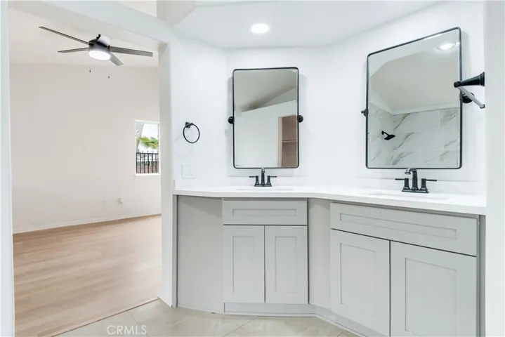 The interior offers a bright and inviting kitchen complete with quartz countertops, a center island with breakfast bar seating—perfect for both everyday living and entertaining. The living room features soaring ceilings, and a distinctive fireplace that is shared with the kitchen area, adding warmth and character to the home.
