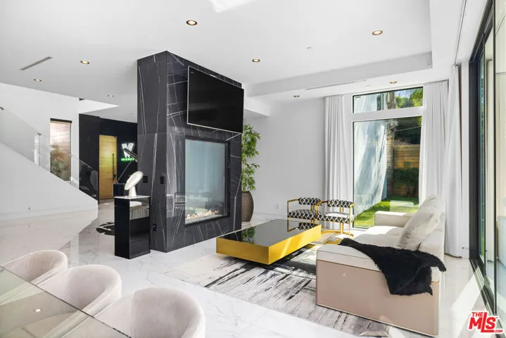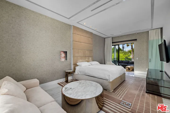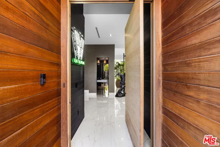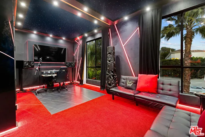 Set behind 10 feet private gates in prime Encino, this bold contemporary estate is designed for those who value space, privacy, and a true entertainer’s layout. With three bedrooms all located upstairs and two professional music studios, one downstairs and one upstairs, the home offers a rare blend of creative functionality and modern design. Inside, soaring ceilings and dramatic floor to ceiling shatterproof glass create an immediate sense of scale and light. White oak floors run throughout the open concept layout, connecting the main living areas with effortless flow. The design is clean and striking, yet warm and inviting, ideal for both everyday living and hosting on any scale. The kitchen commands attention with an oversized Calacatta quartz island, custom cabinetry, and appliances, all opening directly to expansive living and dining spaces that overlook the backyard. A statement wood staircase with integrated step lighting leads upstairs, where all four bedrooms are thoughtfully positioned for privacy. The primary suite is both spacious and refined, featuring double door entry, a private balcony, two custom walk in closets, and a spa style bath with a freestanding soaking tub and sleek, modern finishes. The backyard is built for enjoyment, featuring a pool, spa, water feature, generous lawn, BBQ area, and multiple seating and entertaining zones enhanced by full surround sound. Whether hosting large gatherings or enjoying a quiet evening, the outdoor space delivers versatility and impact. With paid off solar, advanced security, gated parking, a two car garage with direct access, basketball half court, EV charger, and ample storage, this home checks every box. Contemporary, private, and thoughtfully designed, this Encino property stands out for its scale, creativity, and lifestyle appeal.