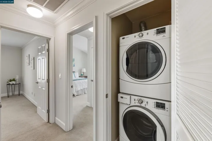 Beautifully maintained Eastridge upper-level condo at the top of San Ramon’s Bollinger Canyon Rd. Gated community w/in a mile of City Center, year-round farmers market, The Marketplace shops, restaurants, Central Park, library, community ctr, Iron Horse Trail. 1074+/-SF. 2 bds w/en suite bathrooms, mirrored closet drs. 2 bathrooms w/single sink vanities, tub/shower combos. Inviting entry. Vaulted ceilings. Fresh int paint. Crown molding. Tile & carpeted floors. Updated central AC (2019). Abundant natural light. Living rm w/wood-burning fireplace, slider to view balcony & storage closet. Dining area, ceiling fan/light. Well-appointed kitchen w/granite counters, richly stained cabinetry, upper glass-faced cabinets, stainless steel refrigerator, new Samsung range, dishwasher & microwave. Front-facing window over stainless-steel sink. Washer/dryer behind closet drs. Multiple storage closets. Updated exterior. Exclusive enclave of condos on park-like grounds. Towering redwoods. Walking trails. App-controlled security gate. Access to 2 swimming pools, spas, gym. Entertain family & friends at clubhouse. Located between Canyon Lakes & The Bridges Golf Courses. Near freeway. Top-rated SRVUSD schools w/in 2 mi. Assigned parking space. Abundant guest parking.
