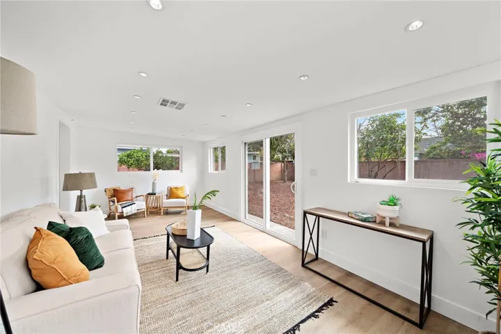 Absolutely stunning and completely remodeled with modern finishes throughout, this charming cottage-style 3 bedroom, 1.5 bath single-level home currently offers approximately 1,288 square feet of living space. Title shows the house with 988 SqFt, plus there is a spacious enclosed patio (approximately 200+ sq ft, not permitted) AND an office/hobby/flex room (approximately 100+ sq ft, not permitted) converted from part of the garage. Both room additions are beautifully finished with same flooring, lighting, windows, and vents to match rest of home. It is located on a quiet cul-de-sac in a pride-of-ownership neighborhood. From the moment you arrive, the home’s inviting curb appeal welcomes you with a lush grassy lawn, colorful gardens, charming white picket fence, and a tiled covered entry. Inside, everything is New! New! New! featuring brand new wood-vinyl flooring throughout, new dual pane windows, new raised panel interior doors, high baseboards, new mirrored closet doors, fresh interior paint, recessed lighting in every room, brand new central A/C and heating system, and ceiling fans in all 3 bedrooms. The light and bright living room flows seamlessly into the completely redesigned kitchen boasting quartz countertops, custom self-closing cabinetry, stainless steel appliances, a farmhouse sink, and an eat-in dining area. The main bathroom has been fully remodeled with a stylish vanity, LED touch-light mirror, and a tub/shower combination with designer tile surround, while the half bath is also brand new and conveniently configured as a Jack & Jill between the secondary bedrooms. The converted enclosed patio is finished to feel like a comfortable family room or bonus room, complete with washer and dryer hook-ups for inside laundry. The single car garage door opens to a storage room. The large wrap-around private backyard is a blank canvas ready for your imagination, featuring block wall fencing, multiple fruit trees including avocado, and two large storage sheds, offering endless possibilities for entertaining, gardening, or a future ADU. Ideally located near shopping, parks, schools, freeways, the vibrant dining and entertainment scene of Santa Ana, and just a short drive to world-class shopping at South Coast Plaza, this turnkey home offers style, comfort, and exciting potential.