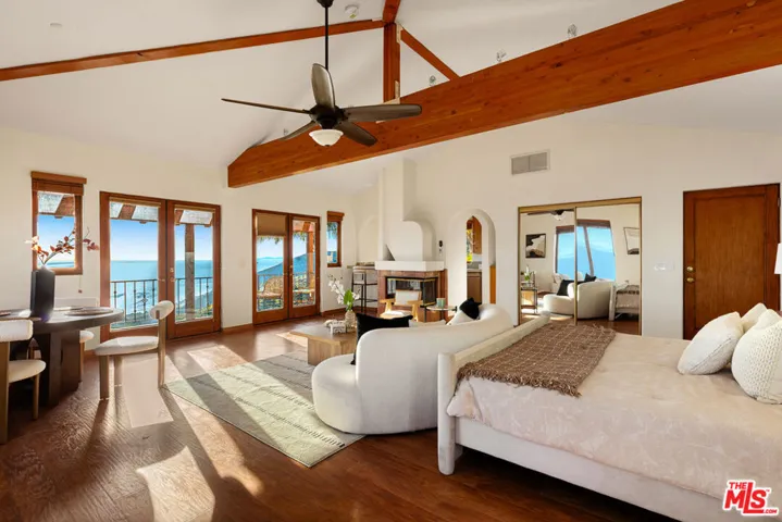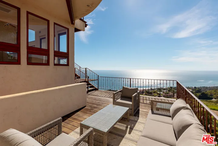 Experience sweeping, panoramic views of the azure blue ocean and mountains from this coastal retreat in western Malibu, perched on a private street above world-famous beaches and just moments to the Trancas Country Market, Zuma Beach, Leo Carillo, and prime surfing at County Line beach. Giant picture windows frame striking vistas from every room, and beautiful stained glass perfectly captures natural light for added color and pop of multiple offshore islands. The formal living room features lofty double-height vaulted ceilings, with French doors openings to viewing decks and sunny ocean-facing balconies. Wide-plank oak floors flow throughout the home’s entertaining spaces. The custom kitchen is fitted copious cabinetry, top-of-the-line appliances, center island with serving ledge and breakfast bar with circular seating, and recipe desk as clerestory windows offer garden and ridge line views. Nearby, the formal dining room is appointed with a built-in China cabinet and serving bar. Upstairs, discover a loft-style pajama room and lounge for relaxing and conversation with family and friends. The large primary suite has private balcony access, fireplace, sitting area, and a series of windows framing blue skies and gorgeous sunsets over the Pacific from the private exterior terrace. There is a walk-in closet and a spa-inspired bath with a jetted tub, glass shower, and dual-sink vanity as well as a circular office with built-ins. Outside, enjoy numerous spaces to lounge and dine al-fresco amidst soothing ocean breezes. Above the detached three-car garage is also an ADU/guest quarters with four elevation vistas of the ocean and mountains, with exposed beams, full kitchen, and private viewing balcony. A housekeeper’s quarters are located in the sub-level below the living room. A large motor court affords parking for a number of cars, and a gated long driveway adds privacy and security. Relish a new way of life from this fresh vantage point with views that stretch from Catalina to the Channel Islands. Venture up scenic Pacific Coast Highway to Point Mugu, spend the weekend wine tasting in Santa Barbara, bike, explore hiking trails, or commute to Santa Monica and the Westside or west to Camarillo within a thirty-minute drive. Central to so many destinations and recreational possibilities, this truly is paradise found. This property is equipped with solar panels (owned) plus fire sprinklers and has easy access to the 101 via Encinal Canyon and Kanan Road.