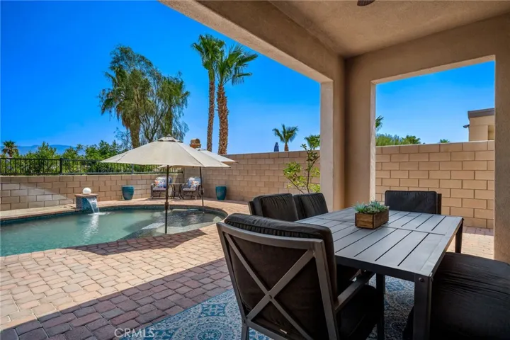 Located in the desirable community of The Gallery in Palm Desert, this Ponderosa built, 4 bedroom, 2.5 bath home offers 2,596 sq. ft. of stylish living space. A gated courtyard entry leads to an elegant rotunda, high windows, and 12 ft. tray ceilings that fill the home with light. The formal dining room is perfect for entertaining, while the kitchen boasts black granite counters, double ovens, and a Sub-Zero built-in refrigerator. The fourth bedroom is currently used as an office with a walk-in closet for added storage. The home is powered by 40 solar panels and a Tesla back up battery that are paid off. Enjoy resort-style outdoor living with a covered patio featuring recessed lighting and a mist system, plus a Pebble Tec pool with tanning shelf. The private backyard offers low-maintenance landscaping and stunning mountain views. Two attached garages accommodate three cars. This home blends elegance, comfort, and function in one of Palm Desert’s most sought-after neighborhoods.