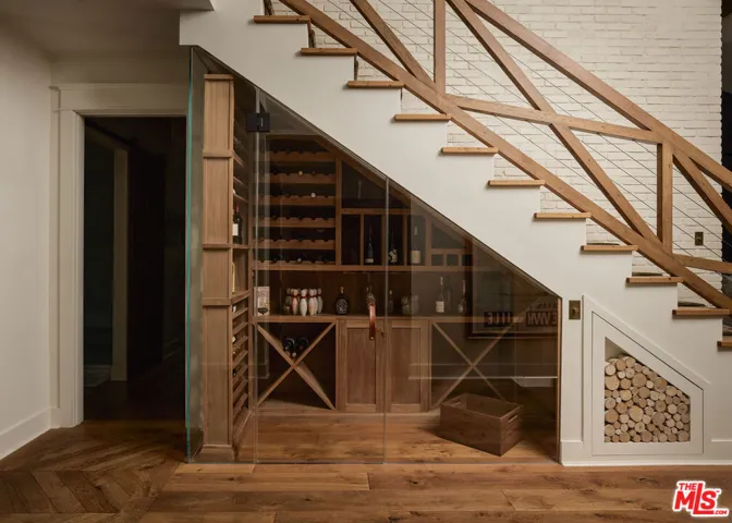 Welcome to this picture-perfect country farm house on an idyllic cul-de-sac, beautifully remodeled with moments tastefully curated for savoring all of life’s most wonderful comforts and pleasures. The limewashed tumbled brick facade is complemented by rustic lighting, exposed beams, a barn-style garage door, and porch swing set amidst manicured landscaping. Through the elegant arched glass-paned front door, discover wide-plank wood floors, lofty vaulted ceilings, and organic materials. With organization and space-saving top of mind, every section is thoughtfully optimized. The prize of the foyer is a quaint temperature-controlled under-stair wine store, encased in glass with an old-town feel. The delightful kitchen includes a large island with farm sink, Viking cooktop with hood and pot filler, Miele espresso, custom paneled refrigerator, bread box, and pantry, all accented by brass deVOL Kitchens hardware and fixtures. Nearby, enjoy family gatherings in the sunlit dining area. The European ski lodge-inspired primary suite includes an antique Tuscan farmhouse stone accent wall with fireplace, vaulted ceilings, plumbed coffee system, beverage refrigerator, and sitting area. Its en-suite bath is appointed with a dual-sink vanity, separate soaking tub, oversized rainwater shower, and bay window ledge, while the custom walk-in closet features numerous built-ins. The family room opens to the outside via sliding pocket doors, perfect for indoor-outdoor flow and an al-fresco ambiance. There is also a den/gaming lounge with a speak-easy-style bar as well as a media/television room. Secondary bedrooms and bathrooms are also well-done and light-filled, and they are even equipped with charming day swings for the young at heart. The finished attic has been transformed into a secret hideaway for story time and sleepovers! Modern conveniences and fine details found throughout include authentic French oak floors imported from the Lorraine region, all century-old solid wood beams, Forbes & Lomax switch plates and toggles, and five HVAC systems for optimum climate management. In the backyard, roam and play on the grassy lawn or relax on the sprawling patio. If desired, there is also room for a pool. This fantastic lower Nichols Canyon location in the Hollywood Hills is central to all, close to film studios and just moments to hiking trails, iconic landmarks like the Hollywood Bowl, the Valley, downtown LA, and the Westside.