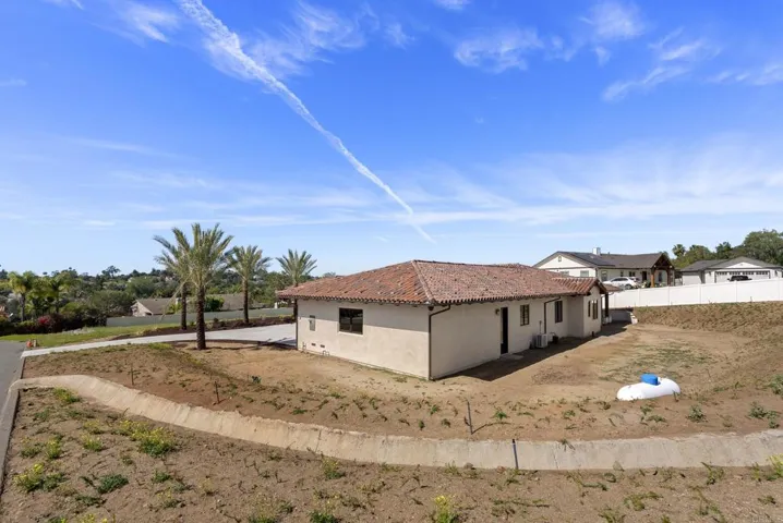 Welcome to this brand new custom Spanish estate, a unique property you might expect to find in Rancho Santa Fe, thoughtfully designed and handcrafted over four years by its owner to honor the romance and integrity of true Spanish architecture. Set on over an acre of Vista land and tucked into a small enclave of custom built homes, this single story residence offers privacy with no HOA and no Mello Roos, all while being less than a 10 minute drive to vibrant Downtown Vista, local dining, shops, and major highways for easy commuting throughout North County. As you approach the home, the classic Spanish tile roof, covered wraparound front patio, and handcrafted wood garage doors immediately set the tone. Upon entering, your gaze is drawn to a custom stained glass window at the entry, an artistic ode to Spanish nature that casts warmth and color as it frames the front door and welcomes you inside. The front door and arched interior doors were all handcrafted by the seller, further adding to the authenticity and architectural integrity of the home. Offering 3 bedrooms, 3.5 oversized bathrooms, and a spacious den, the flexible layout is designed for both everyday living and elevated entertaining, with the den easily serving as a game room, playroom, executive office, or even a fourth bedroom. Inside, soaring vaulted wood trimmed ceilings, rich warm wood posts, graceful arches, and Sausalito tile flooring create depth, texture, and architectural character throughout the home. At the heart of the estate, the chef’s kitchen is both striking and functional, featuring an 8 burner Viking range, built in side by side refrigerator, and a custom copper hood that anchors the space with warmth and craftsmanship. Custom cabinetry includes thoughtful pull out drawers for organization, while a large walk in pantry offers wall to wall storage and a dedicated appliance counter to keep everyday essentials tucked away. Aluminum clad French patio doors line the home, filling the interior with natural light and seamlessly blending indoor and outdoor living. A dramatic gallery hallway illuminated by statement chandeliers leads to thoughtfully curated spaces, including two statement fireplaces, one anchoring the main living area and another creating ambiance on the covered outdoor patio. A cozy oversized reading nook is perfectly positioned to capture glowing western sunsets, while one bedroom is thoughtfully split from the others, ideal for generational living or private guest quarters. The primary suite offers a true sanctuary with private patio access, custom bedroom cabinetry, an expansive custom walk in closet, and a spa inspired bathroom featuring a jetted soaking tub and oversized walk in shower adorned in Spanish tile. Even the everyday spaces were elevated, including a generous laundry room with ample storage and under cabinet lighting. Designed for year round comfort, the home features dual air conditioning systems, whole home surround sound, and a fully integrated security video system. An oversized three car garage with custom wood doors completes the property, while the expansive acreage offers room to build your own dream yard spaces, whether you envision a pool, garden retreat, sport court, or outdoor kitchen under the stars. This is more than a home. It is a labor of love, built with heart, heritage, and intention. Your next chapter begins right here at 2525 Date Palm Court in Vista.