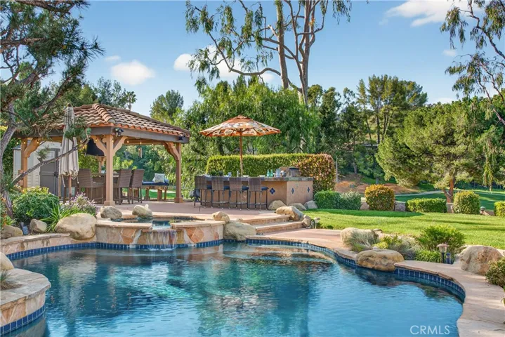 Ideally positioned at the end of a quiet cul-de-sac within the gated community of Calabasas Hills Estates, this beautifully appointed residence captures rare open views across the 9th fairway of Calabasas Country Club toward the clubhouse and surrounding hillsides — a setting seldom available in this centrally located Calabasas neighborhood. Light-filled interiors, soaring ceilings, and expansive windows create an inviting atmosphere throughout, while rich hardwood floors anchor the main living areas and frame peaceful golf course views. At the heart of the home, the updated kitchen and family room create a seamless open-concept space ideal for everyday living and entertaining. The kitchen features custom hand-distressed cabinetry, natural stone countertops, a farmhouse sink with oil-rubbed bronze fixtures, and premium Thermador appliances including a six-burner range, oven, microwave, and refrigerator. A generous center island with pendant lighting offers seating while overlooking the family room and backyard. The family room is anchored by a fireplace and large mounted television, with expansive windows showcasing tranquil yard and fairway views. Upstairs, the primary suite offers elevated ceilings, sweeping golf course vistas, and a fireplace, while the bath features dual vanities, a soaking tub beside the window, and a glass-enclosed stone shower. The flexible floor plan includes one bedroom on the main level and three upstairs, along with a spacious bonus room ideal for a theater, office, gym, or possible fifth bedroom. Outdoors, the backyard is designed for relaxation and entertaining, featuring a pool and spa with negative ionization system, lawn, and mature landscaping overlooking the fairway. A covered pavilion with dining area and television anchors the outdoor living space, complemented by a BBQ center with built-in DCS gas grill, bar seating, and a Weber charcoal grill. Outdoor speakers and integrated sound create a fully connected environment. The home is offered with premium features rarely included in a sale, including a refrigerated wine cabinet with capacity for approximately 300 bottles along with all televisions. Security features include an updated Ring alarm with seven cameras, anti-break-in window tinting, whole-home generator with automatic gas shut-off, and automatic water shut-off system. Residents enjoy gated security and optional access to Calabasas Lake, The Commons, and award-winning Las Virgenes schools.