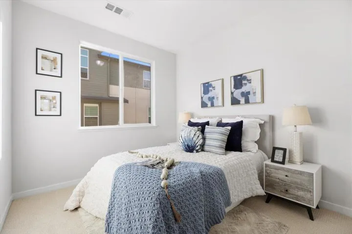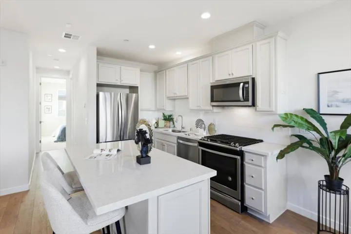 Constructed in 2020 by renowned luxury builder Toll Brothers, this beautifully maintained 3-bedroom townhome is nestled in the desirable Parkside community of Milpitas. What truly sets this home apart is the exceptional natural light that fills the space. Expansive windows invite sunshine into every corner, enhancing the homes airy and uplifting ambiance. To the north, the property enjoys an open outlook toward a tranquil creek and the apartment community beyond, creating a pleasant sense of depth and privacy. The main living level is thoughtfully arranged for modern living. A seamless flow connects the living room, dining area, and kitchen, making everyday life and entertaining feel effortless. A private patio extends the living space outdoors. Upstairs, the primary suite serves as a peaceful retreat with a walk-in closet, dual vanities, and a spacious walk-in shower. Two additional bedrooms provide flexibility for family, guests, or creative space. Low HOA covers water and garbage, along with a valuable solar credit benefit to help offset electricity costs.Conveniently positioned near Great Mall, Bay Area Rapid Transit (BART), Costco, Trader Joe’s, and top-rated schools , this home also benefits from no rental restrictions an increasingly rare advantage.