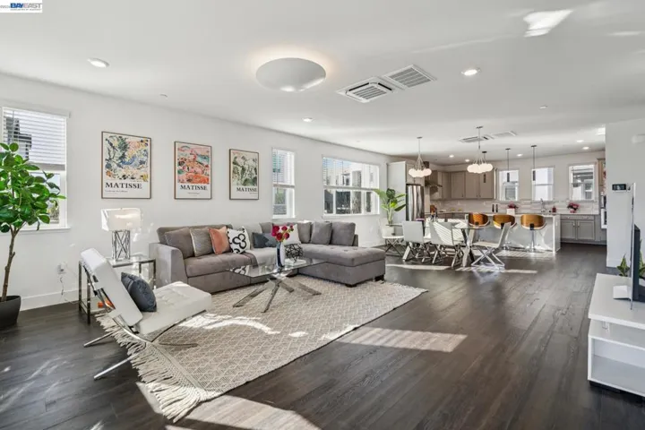 Stylish Alameda’s Bay 37 community. Built in 2021, this smart home is fully detached 3 level corner location boasting lots natural light. Features 4 bedrooms, 3.5 baths and 2,400 sq/ft of living space with a 2-car garage (EV-charger ready) Upgrades include solar panels, premium flooring, stylish new lighting and plantation shutters, this all-electric, air-conditioned. The ground level features an ensuite bedroom and entry. The expansive main living level, with 9-ft ceilings, includes a large kitchen with a 36-inch induction cooktop, stainless appliances, quartz counters, a large island and pantry. The dining and living areas are bathed in natural light and open to a spacious front deck. Upstairs, enjoy a coveted layout with 3 bedrooms, 2 baths and side-by-side laundry. Its greenbelt location is ideal for walks with your furry friends, a bike ride or a stroll. This home is a 5-minute walk to Alameda Landing’s shopping (w/ popular destinations like Target, Safeway, Jollibee & In-N-Out) and 3 minutes to the free boat shuttle to Jack London Square.