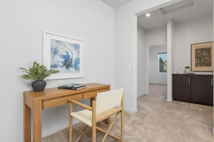 Experience an elevated lifestyle in this nearly-new, energy-efficient masterpiece. This 2-year-old turnkey smart home is a pristine residence packed with high-end upgrades, headlined by a fully PAID solar system, premium window coverings along with a tankless water heater. The open-concept main floor features luxury laminate flooring and a gourmet kitchen with a massive Quartz island, custom tile backsplash, and full stainless steel appliance package. Upstairs, find a versatile layout with luscious carpet, ceiling fans in all bedrooms, and a convenient laundry room. The Primary Suite offers dual vanities, a separate soaking tub/shower, and a walk-in closet. Fully tech-enabled with Schlage keyless entry, Eero router, and Ecobee thermostat. Private vinyl-fenced yard on one of the biggest lots in the community with finished hardscape; HOA maintains front landscaping. Located in the Rancho Buena Vista HS district with EZ access to Hwy 78, I-5, and I-15. Come see it today!