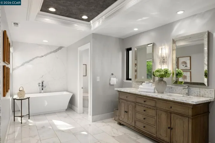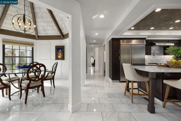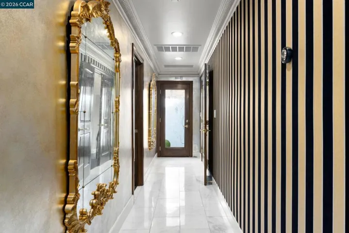 Award-winning Hall of Mirrors transforms Hidden Oak single-level estate into an East Bay Palace of Versailles. $1.4-mil+ in upgrades/features. Stunning architectural details. Master craftsmanship. Impeccable attn to detail. 3911+/-SF on .41 acres. 5 bds. 3.5 marble-finished bths. Soaring & hand-painted coffered ceilings. Custom curated chandeliers, sconces. Polished marble, eng hardwd flrs. “Hall of Mirrors” w/double crown molding, trio of gold-framed mirrors. Andersen drs & wndws. Motorized Hunter Douglas blinds. Formal living rm w/frpl. Formal dining rm. Chef’s kitchen. Marble slab counters, island/bkfst bar, beveled subway tile bksplsh. KitchenAid appls. Casual dining rm w/vaulted rotunda ceiling. Fam rm w/redesigned floor-to-ceiling stacked stone frpl, vaulted ceiling, uplighting in crown molding, wet bar. 3-car garage. Epoxy flr. 2 Tesla powerwalls. Custom storage cabinets. Primary ste. Drs to pool/patio, pvt deck, garden. NARI award-winning walk-in closet. Glass-dr cabinets, island w/drwrs, custom lighting. En suite w/marble finishes. Dual-sink & make-up vanities. Free-standing tub. Shwr. Dual HVAC. Bkyd pool, spa, fountains, custom finished concrete patio. Borders grnbelt. Park-like frt gardens. Towering rdwds. Near dwntwn, frways, top-rated SRVUSD schls, walking trails.