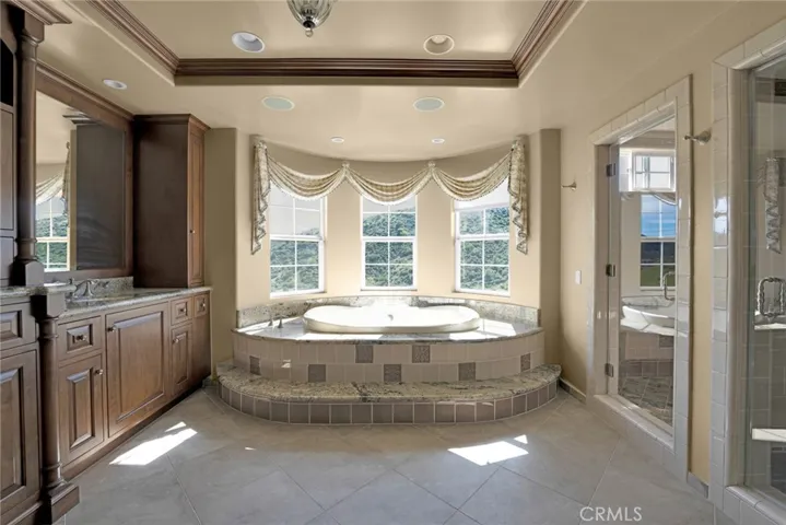 The luxurious primary suite offers dual closets, a soaking tub, walk-in shower, and steam shower for a true spa-like experience. Step outside to a private backyard oasis complete with a custom fountain and serene mountain views ideal for relaxing or entertaining.