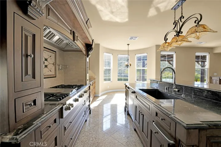 The chef’s kitchen features a large center island with bar seating and upgraded Viking appliances, flowing seamlessly into spacious living and family rooms with soaring ceilings. A custom wine cellar adds a sophisticated touch, while a main-level bedroom is perfect for guests or a home office.