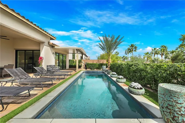 Priced to sell! This extensively upgraded home in the prestigious Stone Creek Ranch neighborhood is an exceptional value offering over $642,000 in custom luxury upgrades, owned solar, and a reverse osmosis water system located within one of La Quinta’s most picturesque gated communities. Perfectly positioned on a premium lot with lots of privacy, this stunning 3,908-square-foot residence captures sweeping sunlight along with the tranquil sounds of nearby streams and cascading waterfalls. The contemporary open layout is highlighted by soaring 12-foot ceilings in the great room, four spacious bedroom suites and 4.5 bathrooms, a striking glass-walled executive office, a designer kitchen and bar area, and a versatile flex room with barn doors—perfect for a movie room, casual living space, or potential fifth bedroom. The primary suite offers a private retreat with custom marble finishes, a custom-designed walk-in closet, and direct access to the lush backyard oasis. Additional highlights include a resort-style backyard, featuring a sparkling pool and spa surrounded by premium pavers, multiple lounging areas, two solid pergolas, a large awning with misters, and corner bi-fold doors that seamlessly open to blend indoor and outdoor living. It has been professionally decorated by Arhaus with a few Restoration Hardware pieces included. It is being offered turnkey furnished to make moving in an easier and more enjoyable experience. Please come and view this stunning property while it is still on the market!