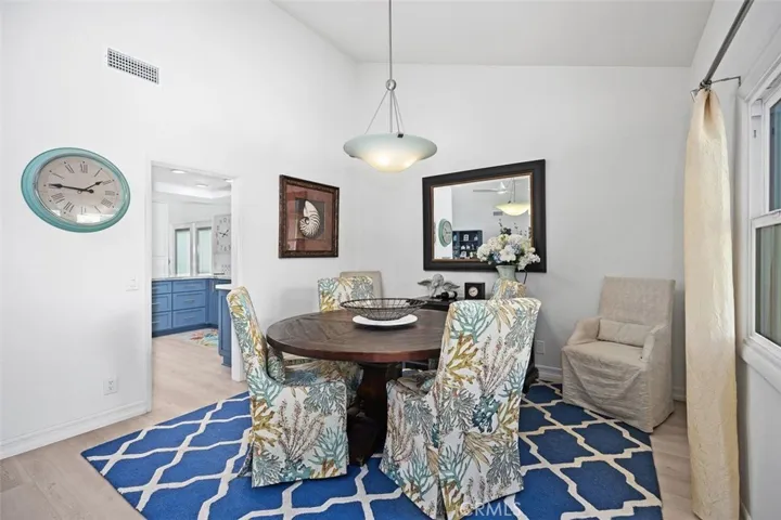 The central living area serves as the heart of the home, where skylights and windows flood the interior with natural light and vaulted ceilings create an atmosphere that feels open, airy, and inviting. Designed for both grand entertaining and intimate gatherings, the space flows effortlessly into the home’s dining area.