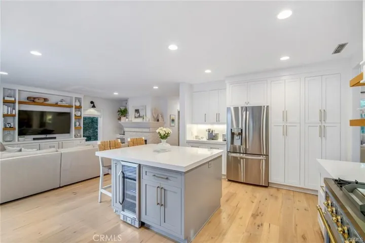 Upon entering through the charming Dutch door, the ambiance of cathedral ceilings, resplendent chandeliers, and bespoke wainscoting in the luminous living and dining areas beckons. The kitchen features quartz countertops, a herringbone tiled walls, an ample supply of white cabinets, trendy floating wood shelves, and the breathtaking baby blue and gold ILVE range. The family room is adorned with considerate built-ins, a second fireplace, and French doors, exuding brilliance. A downstairs bedroom with an accompanying full bath offers the flexibility required for guests or family.