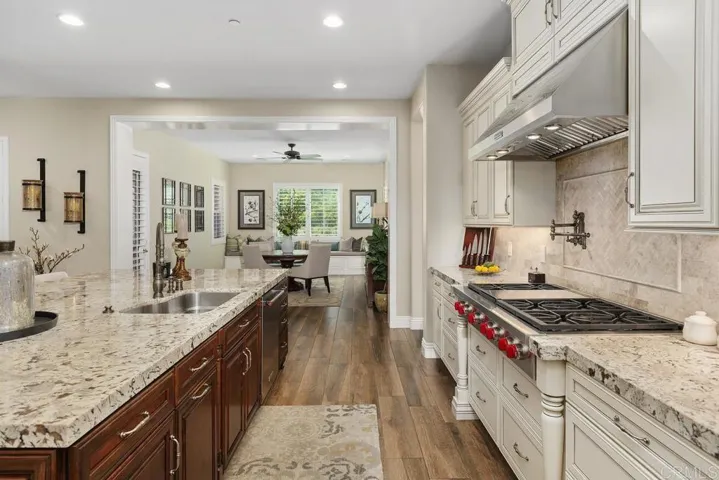 Luxury Estate with Panoramic Views in Amber Ridge Estates We are pleased to present 3960 Ibbetson Street, a luxurious custom home in the prestigious Amber Ridge Estates community in Corona, California. This beautiful home, completed in 2016, boasts a spacious 0.73-acre lot and approximately 4,710 square feet of living area. This four-bedroom, 4.5-bathroom estate also features a detached casita with its own private entrance, perfect for in-laws, a home office, or a guest suite. As a luxurious estate in Corona, this home offers the perfect combination of comfort and entertainment. With its spacious living areas and four-car garage with epoxy flooring, this home is a dream come true. The home also offers panoramic views of the surrounding mountains and the city. Additionally, the home is situated directly behind Cleveland National Forest, providing complete solitude and no rear neighbors. And the best part? This beautiful home offers no HOA and no Mello-Roos taxes. The gourmet kitchen, which serves as the heart of the home, is beautifully remodeled and designed to provide the perfect culinary experience. The home boasts custom-made Decora cabinetry, including drawer organizers, a large island, a prep kitchen, and top-of-the-line appliances such as Sub-Zero refrigeration and wine storage, a Wolf 48-inch six-burner range with infrared griddle, Wolf professional double ovens, and two dishwashers. Additional features include Waterstone fixtures and a reverse osmosis system. Step outside and enjoy the backyard, which is perfect for relaxing and entertaining. The backyard has been beautifully designed with a resort-style outdoor living area featuring a 40’ by 20’ saltwater pool with water features and an oversized spa. The outdoor kitchen is fully equipped with a Lynx professional grill, Big Green Egg smoker, side burners, pizza oven, heaters, and TVs. It has a covered dining area and several sitting areas, making it ideal for entertaining guests. The property also has a bocce court, a vineyard, fruit trees, and raised garden beds, providing a peaceful retreat outdoors. The list of upgrades and amenities continues with the smart home system, which has speakers and security; owned solar electric panels with microinverters; solar pool heating; California Closets in the primary suite; landscape lighting and drainage; a home gym; and RV parking with full hookups, to name a few. The beautifully designed courtyard and California room are just the icing on the cake for this incredible estate, which offers the best of privacy, luxury, and entertaining spaces, and is located in a beautiful setting with everything Corona and Southern California have to offer.