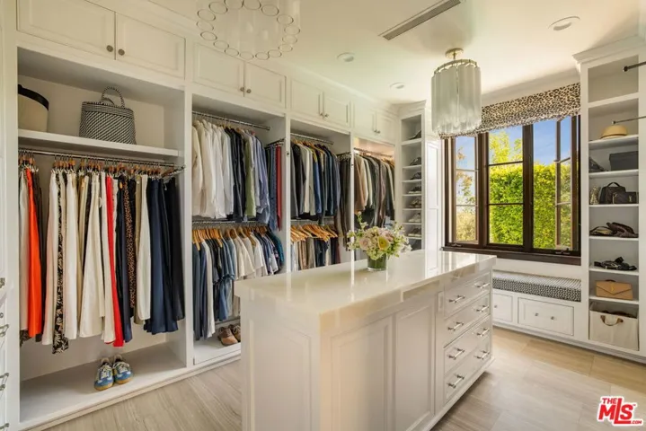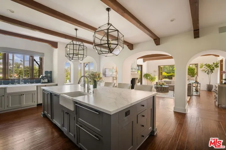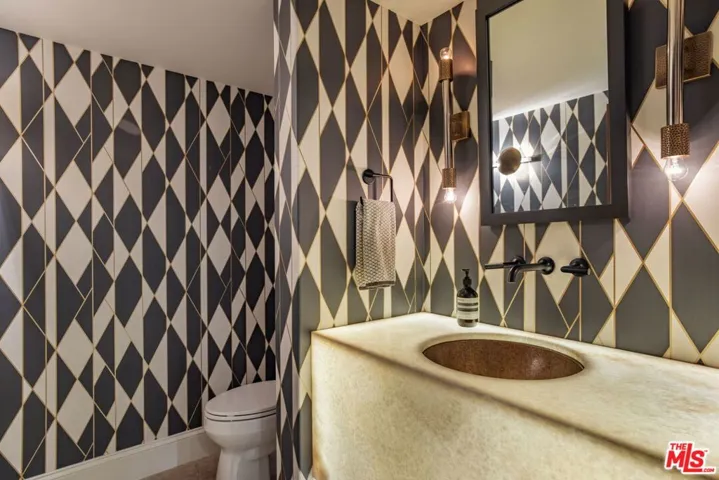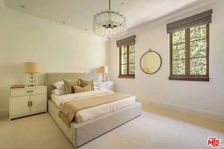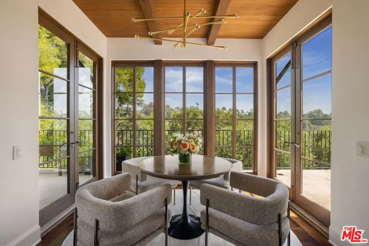 Set on one of Brentwood’s most sought-after streets, this William Hefner-designed Mediterranean estate combines architectural pedigree with sweeping Getty views and resort-inspired living. A long, gated, tree-lined drive leads to the residence, placing it well away from the street and creating a rare sense of privacy. Inside, the home features a total of six bedrooms, with four bedrooms upstairs and the other two bedrooms currently set up as a home office and a private gym, five bathrooms, two powder rooms, high ceilings, French doors, and abundant natural light throughout. The generous floor plan flows effortlessly from room to room and includes a temperature-controlled wine cellar and a sun-drenched breakfast room with floor-to-ceiling glass. Renovated in 2019, the interiors blend timeless Mediterranean character with modern comfort. The outdoor living is truly exceptional. A patio deck with outdoor kitchen, a fire-pit lounge with custom water wall, and a pool and spa positioned to capture the views, create a beautiful setting for both entertaining and everyday living. The outdoor spaces connect with a media and game room complete with pool table. Set into the hillside, the garden offers a private farm-to-table sanctuary with mature citrus, avocado, apple, and pomegranate trees, a terraced kitchen garden planted with herbs and vegetables, and a charming chicken coop with secure run. It is the kind of outdoor space rarely found in Los Angeles.