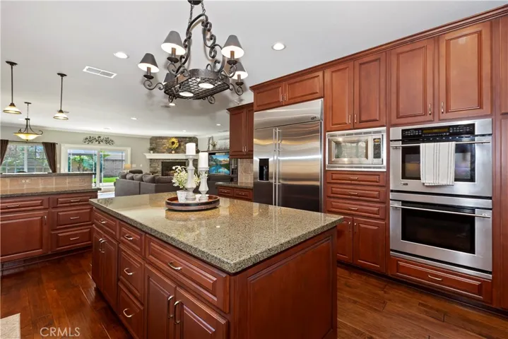 The chef’s kitchen is truly impressive, boasting custom cabinetry, granite countertops, a large island with bar seating, two in-cabinet dishwashers, a 48 inch cook top, double built-in ovens, built -in microwave, and a fully integrated refrigerator. The kitchen opens seamlessly to the formal dining and living areas. Just off the kitchen is a convenient office/study nook that leads to the direct access two car garage, and a separate laundry room with side yard access.