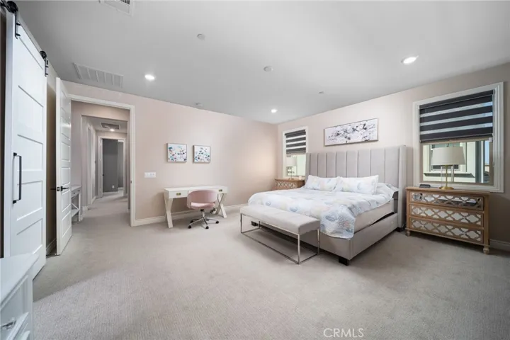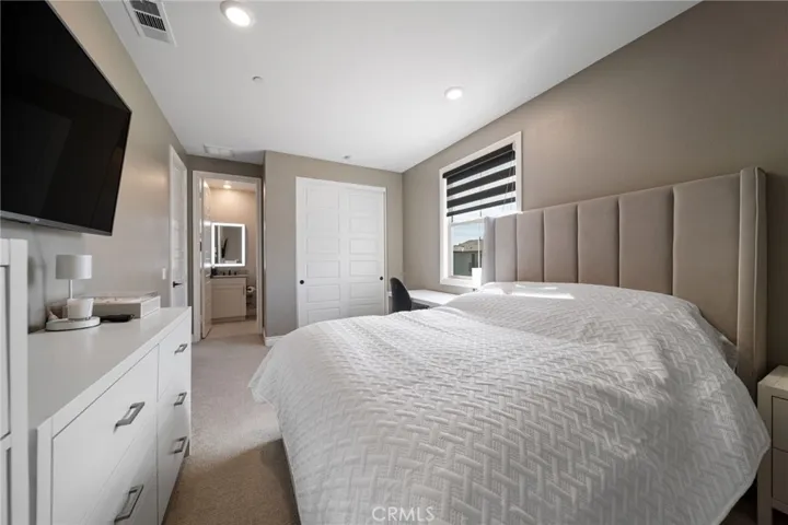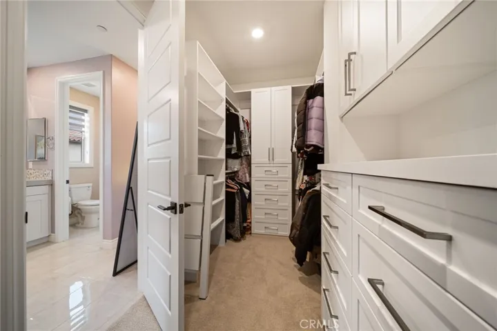 The second level features plush upgraded carpeting, three generously sized bedrooms, a private loft, and an impressive primary suite complete with dual vanities, an oversized shower, soaking tub, and massive walk-in closet with custom built-in shelving and organizers. The laundry room is conveniently located upstairs.