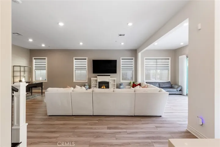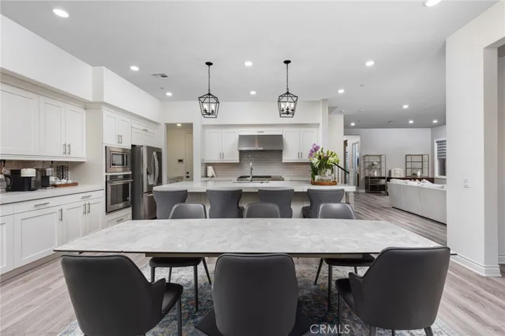 Designed for modern living and entertaining, the open-concept floor plan showcases a gourmet chef’s kitchen appointed with KitchenAid appliances, a 6-burner cooktop and three ovens, cultured marble countertops, an oversized island, farmhouse sink, pendant lighting, and upgraded cabinetry with full-height tile backsplash. Luxury vinyl plank flooring enhances the main living areas, while expansive panoramic sliding doors create seamless indoor-outdoor flow to the oversized designer backyard, perfect for entertaining and al fresco dining.