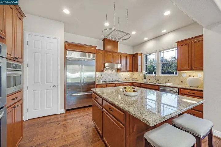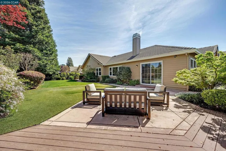 Enjoy refined living in this elegantly designed single-story rancher tucked along a private lane in Clayton’s sought-after Pine Hollow Estates, an 8-home community. Set on a serene .30-acre pool-sized lot, this property offers exceptional privacy, a spacious patio, and beautiful sunset views—perfect for outdoor entertaining or quiet evenings at home. The open floor plan features soaring 10-foot ceilings, 8-foot doors, hardwood floors, recessed lighting, and abundant windows that fill the home with natural light. Formal living and gathering areas are anchored by a striking dual-sided fireplace, while the expansive common room offers built-in cabinetry and a wine refrigerator for entertaining. The chef’s kitchen is designed for both function and style, featuring an island, walk-in pantry with custom shelving, built-in refrigerator, double oven, gas cooktop, and stainless steel appliances. The oversized primary suite provides a private retreat with dual walk-in closets and a spacious en-suite bath with dual vanities, soaking tub, and separate shower. A separate wing with two additional bedrooms and a full bath offers ideal flexibility for extra living space or guests. The secluded backyard showcases mature trees, vibrant landscaping, raised garden beds, citrus trees, and lawn.