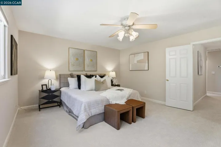Beautiful 4-bedroom, 2.5-bath home located on a quiet court offering 2,391 sq ft of living space on a spacious 9,194 sq ft lot. The home features an impressive layout with high vaulted ceilings, abundant natural light, and a grand staircase leading to the second floor where all bedrooms and two full bathrooms are located, while a convenient powder room is on the main level. The interior has been freshly painted with brand-new carpeting upstairs. Elegant flooring includes wood flooring in the entry, living, and formal dining rooms, and ceramic tile in the kitchen and family room. The primary bathroom has been updated with a refreshed vanity, dressing area, toilet, and flooring. Custom features include built-in desks, shelving, cabinets, a china cupboard with lighting, an entertainment center, and a loft workspace. Energy-efficient upgrades include a whole-house fan, attic fans, dual-zone HVAC (2012), and a fully paid 9-panel SunPower solar system installed in 2019. Additional highlights include two gas fireplaces, a finished 3-car garage with sink and storage cabinets, RV/boat parking, and a large backyard with two patios, fruit trees, and a fenced garden area. Conveniently located near top-rated Pleasanton schools, parks, Livermore Valley wine