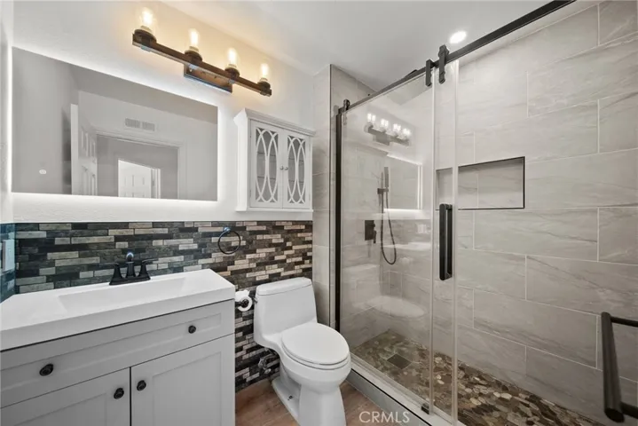 The home has been thoughtfully updated with wide-plank flooring, fresh finishes, and a clean, contemporary aesthetic throughout. The fully remodeled bathrooms showcase designer tile work, sleek vanities, and stylish fixtures, creating a spa-like experience rarely found at this price point.