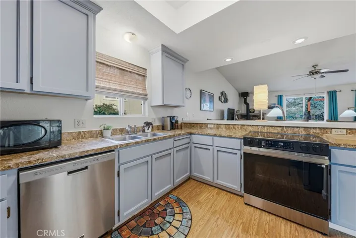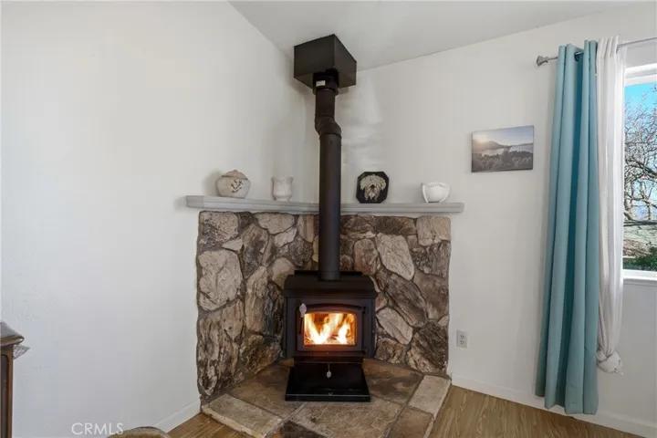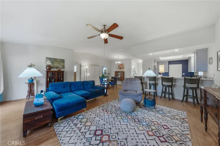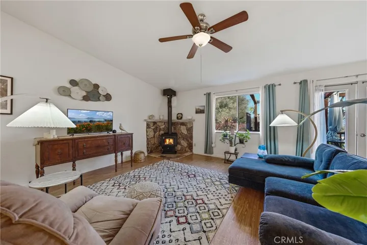 This single-level home is situated in the beautiful Clearlake Riviera community of Kelseyville, CA. A wood-look tile entry leads into an open floor plan featuring vaulted ceilings and vinyl floors, creating an inviting atmosphere throughout the home. The great room is further enhanced by a cozy rock hearth with a wood stove for added comfort. The large kitchen offers ample counter space and a breakfast bar that opens directly to the living area, with an additional dining space conveniently located nearby. The primary bedroom features a private view of the backyard and an en suite bathroom with a tub-shower combo. A second bedroom overlooks the front yard, while the hall bathroom is finished with wood-look tile floors and a tub-shower combo.