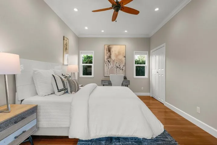 Welcome to this gorgeous 4-bedroom home plus 1-bedroom ADU on a quiet street with top Cupertino schools, including Lynbrook High. Exceptional curb appeal and elegant designer touches throughout. Gleaming solid oak hardwood floors. Open kitchen-dining-living layout with high ceilings and views of the resort-like yard. Stunning kitchen with quartz countertops, breakfast bar, Sub-Zero fridge, Thermador oven, and gas cooktop. Downstairs junior primary suite with large walk-in shower. Spacious main primary suite with high ceiling, walk-in closet, and spa-like bath. Marble fireplace, plantation shutters, and casement windows. HEPA HVAC, water softener, and recirculating hot water line. 2018-built ADU with private entry, yard, and designer finishes including marble countertops. Impeccably landscaped yard with hardscape, French drain, drought-tolerant plants, and Meyer lemon, lime, and orange trees. Entertainers backyard with dining patio, lawn, and natural gas fire pit. Owned solar. Attached two-car garage with epoxy floor and oversized driveway. Walking distance to all three schools, library, and Calabazas Park. Schools: Lynbrook High, Joaquin Miller Middle, and Nelson S. Dilworth Elementary.