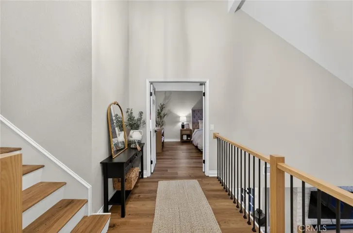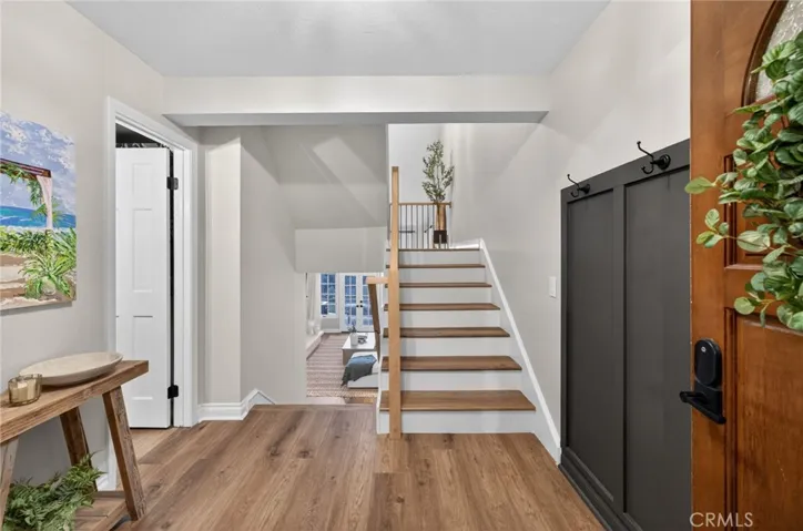 Upon entry, you’re welcomed by a newly installed accent wall with hooks and a fully remodeled bathroom. The main level features a spacious living room with soaring ceilings, abundant natural light, new luxury vinyl plank flooring, a custom fireplace, and built-in shelving. French doors open to the backyard, creating seamless indoor-outdoor living while showcasing scenic views.
