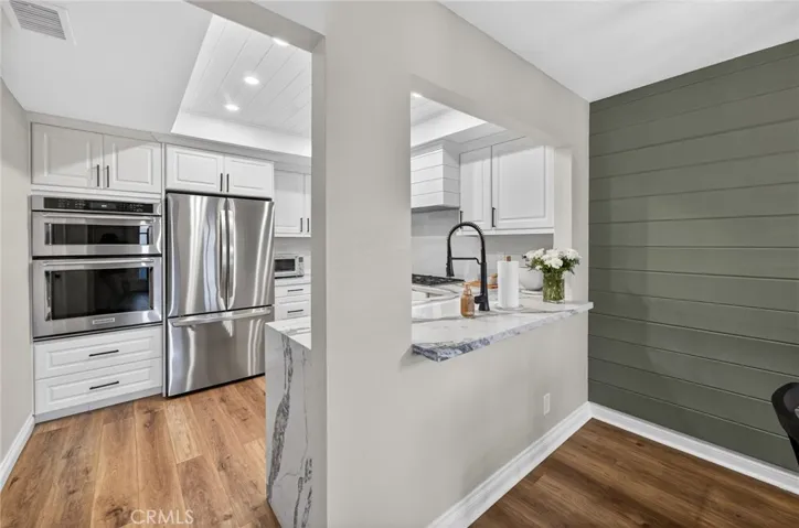 The adjacent dining area is highlighted by a stylish accent wall, pendant lighting, and additional French doors. The fully remodeled kitchen features recessed lighting, custom cabinetry, quartz countertops, a subway tile backsplash, farmhouse sink with gooseneck faucet, 5-burner gas cooktop with hood, double ovens (microwave also functions as a convection oven), dishwasher, French-door refrigerator (included), and a large walk-in pantry.