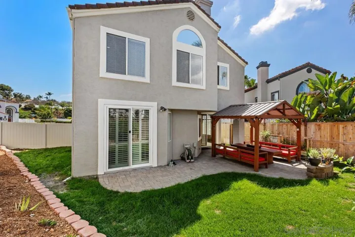 Rancho Del Oro 4-bedroom home with a full bedroom and bathroom downstairs. Fresh interior paint, new flooring, and recent updates give the home a clean, move-in ready feel while maintaining a functional and comfortable floor plan. The entry opens to a bright living room with vaulted ceilings and abundant natural light, creating an open first impression. The kitchen features stainless steel appliances, generous counter space, ample cabinetry, and recessed lighting, and connects to the dining area overlooking the backyard—ideal for everyday living and entertaining. Upstairs, the spacious primary suite includes a private fireplace, dual sink vanity, soaking tub, separate shower, and walk-in closet. Two additional bedrooms and a full bathroom complete the second floor. The backyard offers a private outdoor setting with a covered gazebo seating area and built-in fire feature—perfect for relaxing evenings or hosting guests. Situated in the Rancho Del Oro community of Oceanside, the home is directly across from a neighborhood tot lot and park area and is conveniently close to schools, shopping, dining, parks, and major commuting routes.