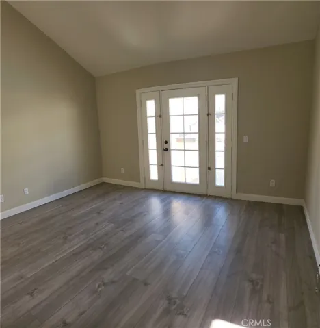 The primary suite includes dual sinks, a walk-in shower, and a large walk-in closet. Multiple French doors throughout the home open to the backyard, creating great indoor-outdoor flow. Additional highlights include newer water-resistant laminate flooring, ceiling fans, elegant chandeliers, window blinds, and a beautiful gas stone fireplace in the family room. The interior has also been freshly painted, giving the home a clean and modern feel.