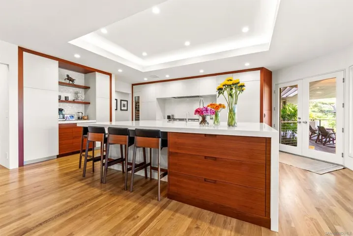 Welcome to this incredible, fully furnished and single level Rancho Santa Fe Covenant home equipped with with top-of-the-line amenities! Privately gated with only 4 homes on the street! Remarkable opportunity live in the West Side of the Covenant designed for refined living and long-term flexibility. This home boasts a modern kitchen bathed in natural light with quartz countertops, center island, hardwood floors and a Wolf 8-burner range, temperature controlled wine cooler, double ovens, walk in pantry. Opens seamlessly to the family room with a fireplace. A dedicated wing houses a primary suite which offers a serene retreat with a spa-like bath, walk in closet, walk in shower and a jacuzzi right out your door on the deck overlooking the property. Enjoy the soothing sounds of the babbling brook that surrounds the home! There is a large private 3-car, attached garage with EV charger and a workout area. Driveway accommodates at least 6 cars! Entertain in the spacious dining room and living room with a Steinway & Sons piano, seating for gorgeous fireplace. This is an ideal setting for both intimate gatherings or grand entertaining. With a large lot and gated entry, this home has been renovated and features 4 large bedrooms and 4.5 bathrooms. There are 3 spacious guest bedrooms – each with en suite bathrooms and there are 3 dedicated office spaces desks. Enjoy beautiful landscaping, large private backyard, outdoor dining area, pool, fire pit, lush greenery including a garden with fresh vegetables, multiple lounging areas perfect for sunset gatherings.