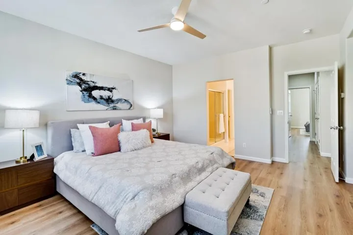 Experience urban living in this stunning 1,788 sq. ft. townhouse style condo nestled in highly coveted Coyote Creek Community. 3-bedroom, 4-bathroom, features Tri-level floorplan. The Main Level 2nd floor: open-concept living area flows seamlessly onto a private balcony, Engineered hardwood flooring. The gourmet kitchen featuring quartz countertops with backsplash, SS appliances, Gas range and built-in microwave. The ground-floor bedroom with a Full en-suite Bath, perfect for guests, multi-generational living or potential rental. Upper Level: Two tranquil master suites await on the third floor, each boasting generous walk-in closets. Premium Features: zoned central Heating and A/C, a dedicated laundry room located near the bedrooms, tankless water heater, and Side-by-Side 2 car garage. Resort-Style Amenities: Enjoy low HOA ($280) dues that cover premium amenities, including a heated pool, fitness center, clubhouse, BBQ area, pet spa, outdoor fireplace, Also covers trash, exterior maintenance, and hazard insurance. Prime Milpitas Location: Unbeatable proximity to major tech hubs like Cisco, SanDisk, and KLA. Enjoy weekend errands at nearby Walmart, or Milpitas Square. With easy access to BART and Freeways 880/237.
