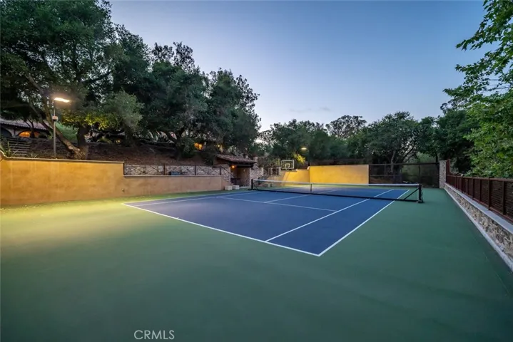 From the front lawn a pathway leads to a professional-grade multi-sport tennis and pickleball court complete with night lighting, viewing areas, a swing-out basketball hoop, and bar seating—an ideal setup for both serious play and social gatherings. In the backyard, a built-in hot tub and cozy firepit offer the perfect setting for relaxing evenings under the stars.