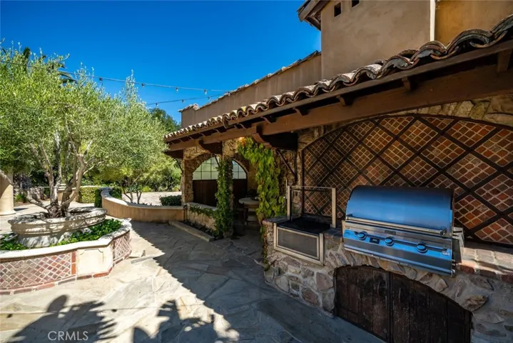 A stone-lined driveway welcomes you to a spacious motor court featuring a detached five-car garage and covered carport—perfect for RVs, trailers, or additional equipment. Low stone walls and manicured hedges guide you toward the main residence, while just beyond the garage a covered patio and workshop overlook a stunning central courtyard. Here you’ll find an outdoor kitchen, wood-fired pizza oven, built-in firewood storage, and a dramatic stone fireplace that creates a warm and inviting gathering space.