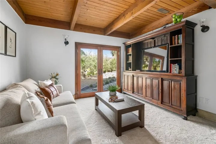 Inside, the home is airy and inviting, highlighted by soaring beamed ceilings, decorative windows, and custom wood-and-metal chandeliers. Concrete floors provide natural cooling, while a dramatic floor-to-ceiling stone fireplace anchors the main living area. Just off the living room, a private office and half bath.