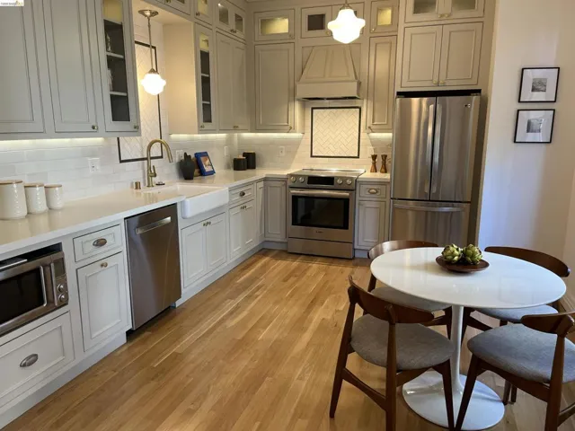 The Regillus is a 1920s Beaux Arts luxury condo building on Lake Merritt. The grand marble lobby leads to formal gardens and terraces with sweeping views of the lake. HOA includes attendant reception desk, insurance, security with closed circuit cameras, internet and cable TV, water/sewer, trash, laundry, building management, maintenance and cleaning staff. Close to Whole Foods, Trader Joe’s and a 5-minute walk to BART. This spacious 2-bedroom, 2 bath 1379 sqft condo features 10 ft ceilings and has been renovated preserving ornate detail with four vintage deco crystal chandeliers. A marble foyer leads into the spacious formal living room with grand, wood-burning fireplace. To the left is a formal dining room. The large, renovated custom kitchen has quartz counters, herringbone backsplash, and custom soft-close cabinetry. Bathrooms have been renovated yet still honor the original 1920s period. Updated electrical panel. This elegant condo features refurbished, white oak hardwood floors with original, large multi-paneled windows on three sides of condo letting in lots of light. Custom window coverings include Belgium linen curtains and motorized black out shades. Includes one garage parking space and private storage room. OPEN HOUSE SAT. 3/28 and SUN. 3/29