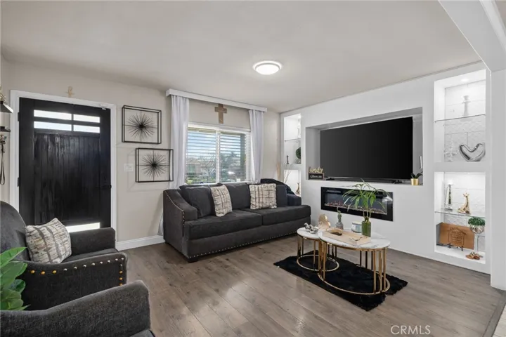 The inviting living room features a custom built-in media wall with an electric fireplace, creating a warm and contemporary focal point. Updated flooring, modern lighting fixtures, and thoughtful finishes throughout the home add to its move-in-ready appeal.