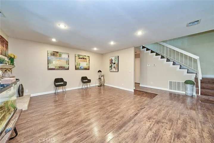 The kitchen offers ample cabinetry, quartz countertops, and stainless steel appliances. Laminate flooring and recessed lighting extend throughout the home, while large windows provide abundant natural light, enhancing the warm and peaceful ambiance.