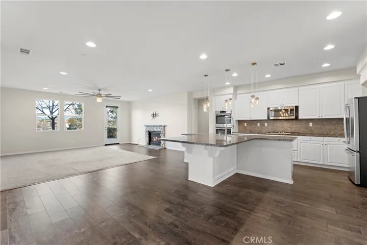 Views! Views! Views! No Rear Neighbors! Turn-key executive home located in the highly desirable Rancho Bella Vista community, built in 2013 and offering approximately 3,823 sq. ft. of beautifully designed living space. This spacious residence features 5 generously sized bedrooms, 3 full bathrooms, a large upstairs loft, and a three-car garage Tandem with epoxy flooring. The open-concept floor plan is ideal for both everyday living and entertaining. The gourmet kitchen showcases a massive granite island with seating, double ovens, stainless steel appliances, custom backsplash, and elegant laminate flooring throughout the main living areas .A convenient downstairs bedroom and full bath provide flexibility for guests or multi-generational living. Upstairs you’ll find a spacious loft, three additional bedrooms, and an expansive owner’s suite complete with a private retreat and breathtaking panoramic views. The fully landscaped backyard is designed to maximize the view with plexiglass fencing for unobstructed scenery, a concrete patio with multiple sitting areas, and a covered California room featuring a stacked stone fireplace — perfect for year-round enjoyment.