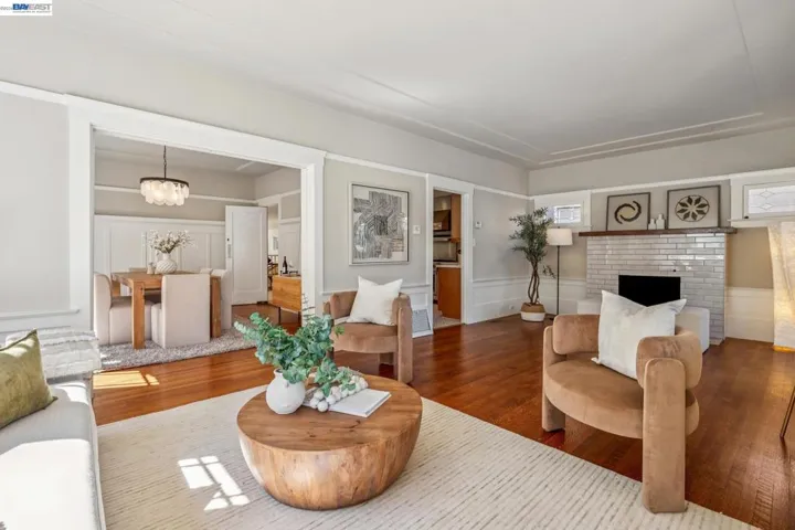 Located on a coveted block in Alameda’s East End, this classic Craftsman offers inviting curb appeal while its modest exterior gives little hint of the impressive scale inside. With over 2,750 square feet of living space, the home opens to a gracious formal living room with hardwood floors and a fireplace that flows seamlessly into a proper dining room. The beautifully updated eat-in chef’s kitchen features new flooring, quartz countertops, a built-in bar, and high-end stainless steel appliances including a Viking Professional range. It overlooks an expansive family room with high ceilings that opens directly to the backyard patio, creating effortless indoor-outdoor living. The home also features dual-zone heating and A/C for year-round comfort. Upstairs you’ll find a built-in office space, a convenient laundry closet, and three spacious bedrooms. The primary suite offers a serene retreat with a remodeled ensuite bath featuring double sinks, a large shower, and a generous walk-in closet. Two spacious additional bedrooms and an updated hall bath with a soaking tub complete the level. A long driveway with a Tesla charger provides ample off-street parking and leads to a detached garage offering additional flex space. Close to top-rated schools, parks, and commuter options to SF!