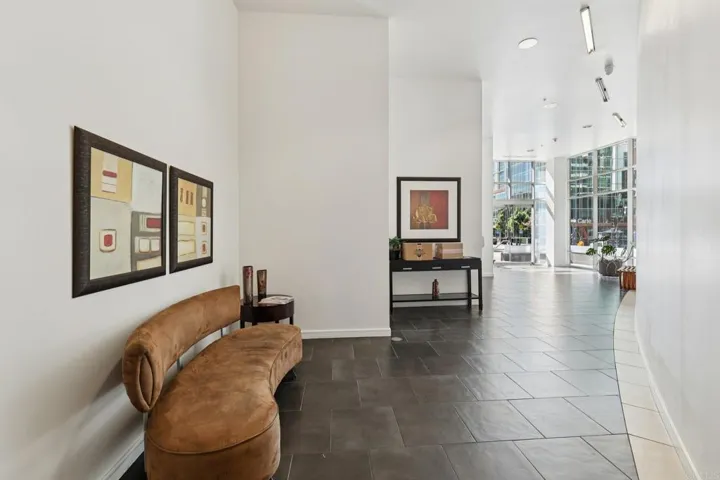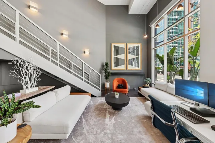 This unit is a one of a kind!!— a rare ground-floor live/work loft in Little Italy, just blocks from the bay, with direct street access that makes it perfect for running a business, entertaining clients, or simply stepping outside your door into one of San Diego’s most vibrant neighborhoods. This stunning residence immediately makes an impression with dramatic 13-foot floor-to-ceiling windows spanning the entire length of the home, flooding the space with natural light. Dual electric shades offer the perfect balance of openness and privacy, featuring one-way daytime shades and full blackout shades for the evening. Inside, commercial-grade laminate flooring flows throughout the open layout, while brilliant lighting highlights the home’s many upgrades. The beautifully remodeled kitchen features sleek high-gloss white cabinetry and modern finishes designed for both style and durability. One of the home’s most distinctive features is the staircase — a true functional work of art — designed with steel cable railings and suspended frosted glass panels that create a stunning architectural focal point the moment you walk in. The staircase leads to an upstairs bedroom and office, making the loft both stylish and practical. The bathroom showcases a gorgeous textured glass tile accent wall, backlit mirror, soffit lighting, and a dual-faucet vanity that adds both luxury and convenience. A street-level patio and walls of windows welcome you at the entrance, reinforcing the seamless connection between indoor living and the vibrant neighborhood outside. And to top it all off, this unique downtown residence includes two parking spaces and two storage units — an incredible luxury in Little Italy. Live here, work here, or create the ultimate blend of both in one of San Diego’s most exciting communities.