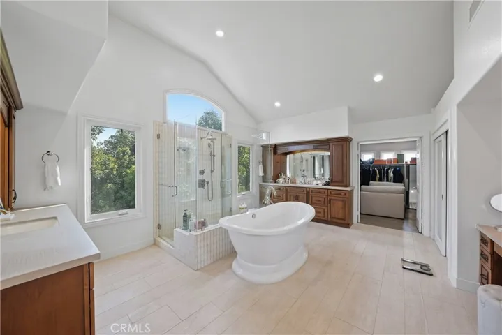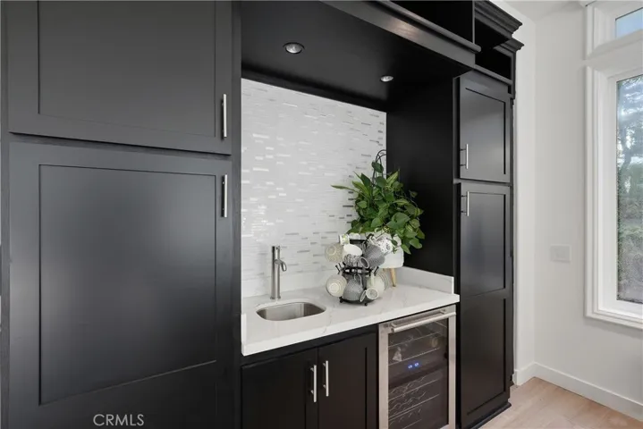 Beyond the dining room, the gourmet kitchen features KitchenAid stainless steel appliances, a generous quartz island, and abundant cabinetry. The kitchen opens to an inviting family room complete with a wet bar, custom black entertainment center with cabinetry and shelving, wine cooler, and a decorative tile fireplace. Expansive windows flood the space with natural light, creating an ideal environment for both everyday living and entertaining.