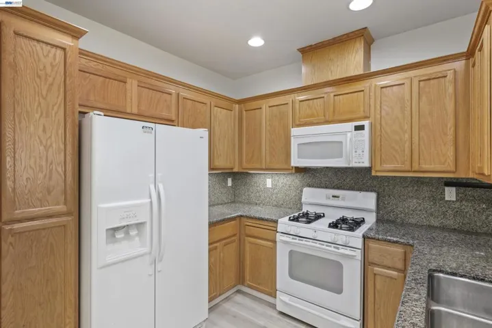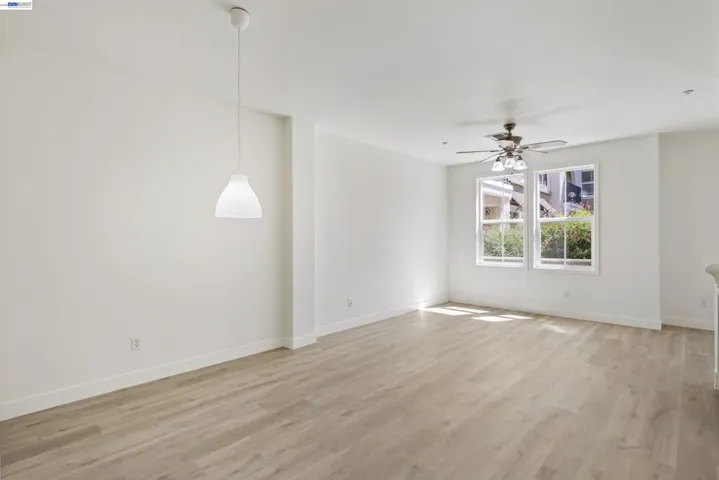 Desirable single level corner end-unit on the first floor offers a lifestyle of luxury and convenience. Large private patio perfect for entertaining and relaxation seamlessly transitions to the serene courtyard, creating a lovely indoor-outdoor living experience. 9-feet ceiling, natural light and open layout great room creates an airy and modern atmosphere. New paint and beautiful LVP flooring throughout the entire unit. Kitchen offers granite counters, maple cabinets, eat-in breakfast bar. Primary bedroom includes a walk-in closet and ensuite bathroom with a double vanity and walk-in shower. The third bedroom provides a versatile space for a home office, gym, creative studio, guest room or playroom. Central AC and heating system and ceiling fans. Washer/dryer in hallway closet. Resort style amenities include a clubhouse with gourmet kitchen, state-of-the-art gym and heated pool and spa. 24-hour secured gate entry. Assigned 2 side-by-side parking spaces in the secured underground parking lot with guest parking spaces and elevator access. Prime location near top rated schools, shopping, restaurants, golf, Kaiser, BART and 580/680. Walk to the new Emerald High School, Bray Commons Park with a fenced dog park, playground, basketball court.