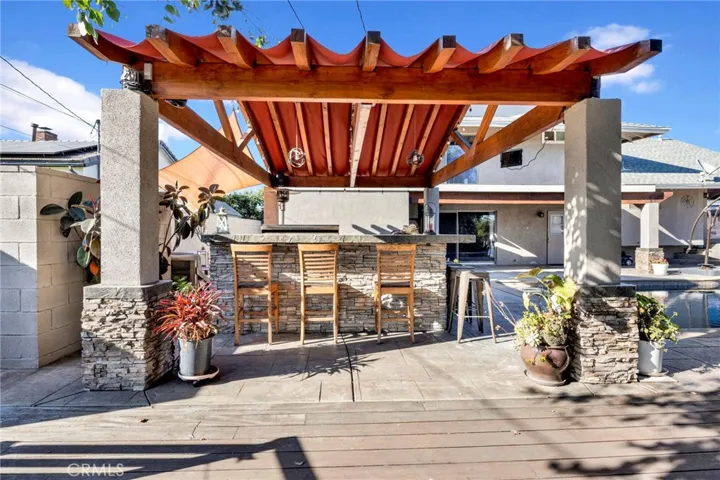 Outdoor living shines here: the expansive backyard includes a raised deck nestled among mature eucalyptus trees, a built-in natural gas grill, and a stone trellis beside the PebbleTec pool. These well-designed outdoor amenities create a true resort-style atmosphere perfect for hosting guests or unwinding at home.