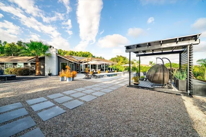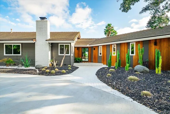 Rare opportunity in the hills of Fallbrook! This private single-level mid-century home with mountain views has been completely renovated with approximately $800K–$900K in upgrades, offering luxury living with no HOA and not located in a high fire zone. Seller’s loss is your buyer’s gain. They upgraded with plans to stay. The thoughtfully redesigned interior features premium engineered ebony hardwood flooring, new Berber wool carpet, ebony-stained solid-core doors, new windows and sliding glass doors, updated electrical, new plumbing, and dual HVAC systems. The chef’s kitchen is beautifully appointed with quartz countertops with waterfall edges, solid walnut floating shelves, Herman Miller lighting, Hansgrohe fixtures, reverse osmosis filtration, a Wolf 30” six-burner convection propane oven, Bosch refrigerator, Summit professional wine fridge, and Samsung dishwasher. The luxurious primary suite opens to a private floating deck and features a spa-inspired bathroom with Scandinavian solid walnut floating vanities, black basalt herringbone tile flooring, Toto toilet, dual Hansgrohe rain shower heads, heated defogging backlit mirrors, and designer finishes throughout. Bathrooms throughout the home include premium Hansgrohe fixtures and heated defogging mirrors. Outdoor living is equally impressive with fully re-landscaped grounds, a 12-zone irrigation system, mature pines, ficus, palms, and jacarandas, plus a heated black premium Pebble Tec pool with Baja shelf and spa. The property also features a 10×10 gazebo with electricity, 20×24 carport with electric and water, and a newly poured concrete driveway. Additional highlights include solar, a travertine entry, two wood-burning travertine tile fireplaces, an oversized two-car garage with butcher block and aluminum workbenches and wall storage, and a 10×12 detached studio currently used as a gym. The mudroom/laundry room includes sealed oiled butcher block counters and Maytag washer and dryer. A truly unique and extensively upgraded single-level Fallbrook retreat offering privacy, views, and resort-style amenities. Will not last!!!!!! Your buyers will be in awe.