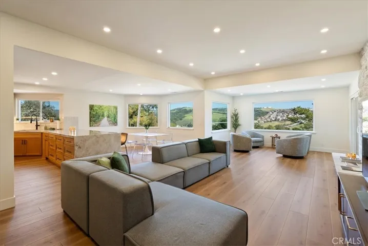 This beautifully remodeled 3-bedroom, 2-bath residence features large picture windows in the living room that frame beautiful green hill views, bringing natural light and scenery directly into the home.
