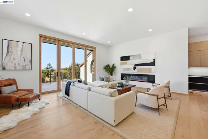 Recently built Berkeley Hills contemporary home with breathtaking panoramic Bay views and ADU. Set on a rare nearly 10,000 sq ft lot. Spectacular sunsets and sweeping vistas can be enjoyed from nearly every room. A dramatic skylight and glass-floor light well bring natural light from the roof through the upper level into the living space below, creating a striking architectural centerpiece and bright open interior. Nearly 12-ft ceilings and a folding glass door system open the living space to expansive decks framing spectacular Bay views. The chef’s kitchen boasts marble counters, Thermador appliances, and a walk-in pantry. Quality craftsmanship defines this residence, showcasing white oak and porcelain tile floors, customized rift oak doors, and top-of-the-line finishes throughout. The serene primary suite features large picture windows and a spa-like bath with radiant heated floors. Rare ~813 sq ft attached ADU with private entrance, full kitchen, living area, and separate meter—ideal for guests, extended family, or rental income. Additional highlights include AC, EV charging, smart switches, 1 GB fiber internet with wired connections in all rooms, a two-car garage, and extra driveway parking. Conveniently located near Albany and North Berkeley shopping, dining, parks, trails.