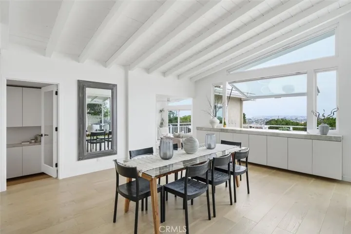 Set on a single level in the Riviera, this home has been beautifully remodeled with a refined, modern aesthetic and sweeping mountain, city and ocean views. Enter through steel 8-foot Pinky’s double doors into a welcoming foyer with a live ficus and engineered hardwood floors that run throughout the home. The dramatic main living area has vaulted ceilings and an effortless indoor-outdoor connection. An accordion glass door opens wide to a newly completed 1,100-square-foot composite deck, designed with multiple seating areas to take in the incredible views. Lighted stairs and smart-home exterior lighting elevate the outdoor experience, while dual-zone wired speakers extend seamlessly from the interior to the deck for easy entertaining. At the center of it all is a stunning kitchen anchored by a massive island topped in premium Taj Mahal quartzite, seating for barstools, prep sink and a beverage refrigerator. Other nice details such as soft accent lighting, Bosch appliances and a Bertazzoni range with brass burners create a kitchen that is equal parts sleek and functional. Adjacent to the kitchen, the formal dining area is positioned beside an oversized custom window that opens directly to the outdoor bar, creating a seamless pass-through for entertaining. A butler’s pantry adds convenience with its own sink and built-in wine and beverage refrigerator. Taj Mahal quartzite continues throughout the indoor-outdoor bar, butler’s pantry and primary bath, tying the spaces together with a cohesive and luxurious finish. Two secondary bedrooms share a bath with a floating vanity, tiled walls, custom maple cabinetry, skylight and a wet-room setup with soaking tub. An additional bathroom features a spacious shower with a rainfall shower head. The formal living area captures the views through oversized windows and opens directly to the back deck through sliding doors. Custom built-ins include a television niche, accessory nook and an electric fireplace with heater. The primary suite is a calming retreat with a walk-in closet and a sliding door leading to a private side yard. The spa-like bath features dual sinks, maple cabinetry, large-scale tile and a lighted mirror. Completing the home is a finished garage with epoxy floors, offering ideal flex space for a workout studio, office or playroom with direct access to the home. Additional upgrades include a 2025 gas tankless water heater, ceiling fans in all bedrooms and living area.